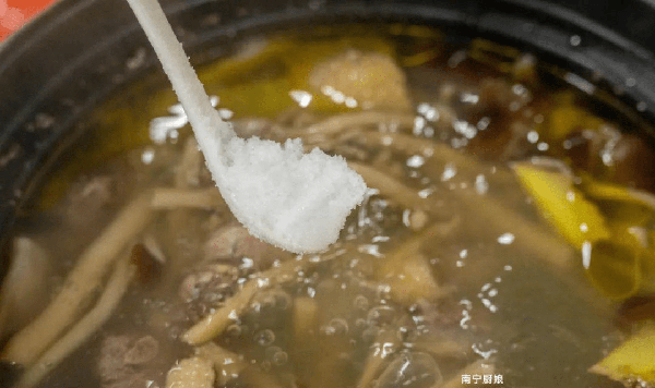5、鴨肉熬制的時間到後,可以看到表層泛著稀薄的一層金黃油光,說明鴨肉的營養有被熬出來,再加入一勺食用鹽調味。