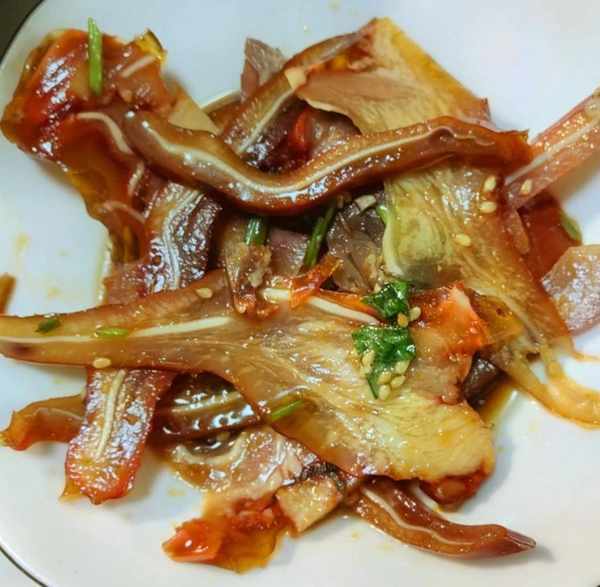 當然山東人習慣把餃子當主食,肯定還要做幾道小菜配著一起吃才過癮。一個是涼拌豬耳朵,這個是蘇新月在樓下的鹵肉攤上買的,鹵得很入味,切的也很薄,吃起來脆脆的有嚼勁,味道特也不錯,不過這是蘇新月和老公昨晚吃的剩菜,剩瞭這麼一小盤,蘇新月直接從冰箱裡端出來就可以吃瞭。
