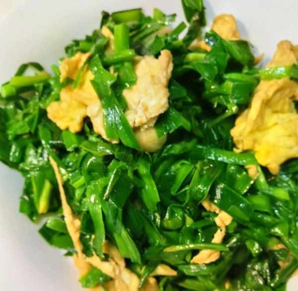 然後是韭菜炒雞蛋,雞蛋和韭菜都是小涵拿過來的,婆婆養的雞下的雞蛋特別香,自己種的韭菜包瞭餃子後還剩不少,全部都給瞭兒媳婦。韭菜綠油油的看著就知道多新鮮,從菜園子裡到嘴裡不過半個小時時間,所以嫩爽多汁不油膩,炒好的雞蛋油汪汪的,搭配著綠黃相間又好吃又好看。