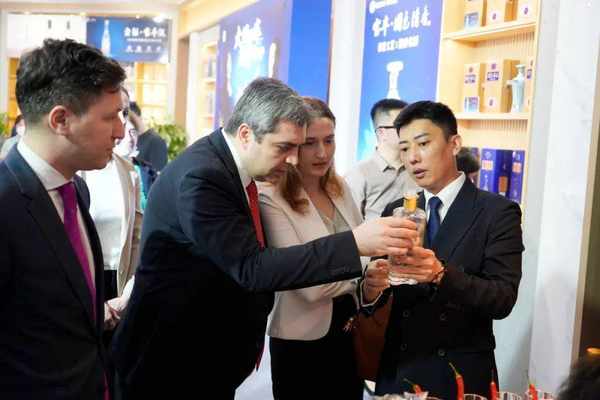 4月11日上午,阿爾赤·卡嵐迪亞大使,別斯克·沙拉申尼澤參贊,中國食品發酵工業研究院研發總監、國際評委黃宇彤一行,在寶豐酒業有限公司董事長王若飛的陪同下,參觀瞭位於成都大成賓館的名酒寶豐酒店展,寶豐酒業有限公司副總經理兼首席品牌官許英傑陪同參觀。