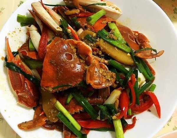 口味蟹:先把蟹洗凈,對半切開,鍋裡放油,爆香薑片跟辣椒絲,倒入蟹翻炒變色,加生抽,料酒,蠔油,翻炒幾下,加入大半碗溫水,胡椒粉,十三香,燒開收汁放鹽,加入蔥段就可以出鍋啦!