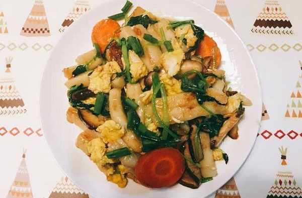 炒年糕:熱油,炒年糕,加些生抽,盛盤,放油,倒入打好的雞蛋,稍凝結盛盤,熱油,放香菇,過兩分鐘放胡蘿卜,翻炒。再加入年糕,翻炒。過一兩分鐘放入剛炒好的雞蛋,再把青菜放入,繼續翻炒。再加些鹽,撒點蔥花,出鍋,盛盤。