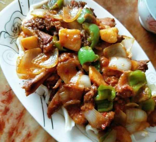 大盤雞:雞肉剁小塊,冷水泡半小時,然後沖洗三遍,雞肉加冷水燒開,水開兩分鐘把沫撇幹凈,撈出沖洗,控幹水分,熱鍋倒油,倒入花椒,出香味撈出花椒,然後鍋裡放白糖攪拌,放雞肉翻炒變色,加入蔥薑蒜,八角草果等調料,放老抽,豆瓣醬翻炒,加開水沒過雞肉,加辣椒,西紅柿(去皮切小塊)幹黃醬(用水拌開)開鍋以後轉小火,蓋鍋蓋燉30分鐘左右,加鹽,放土豆塊,繼續蓋鍋蓋燉10分鐘,加入洋蔥,青椒塊即可!