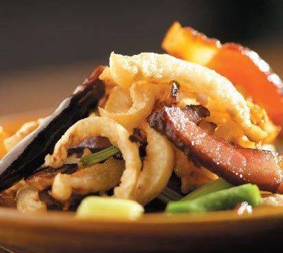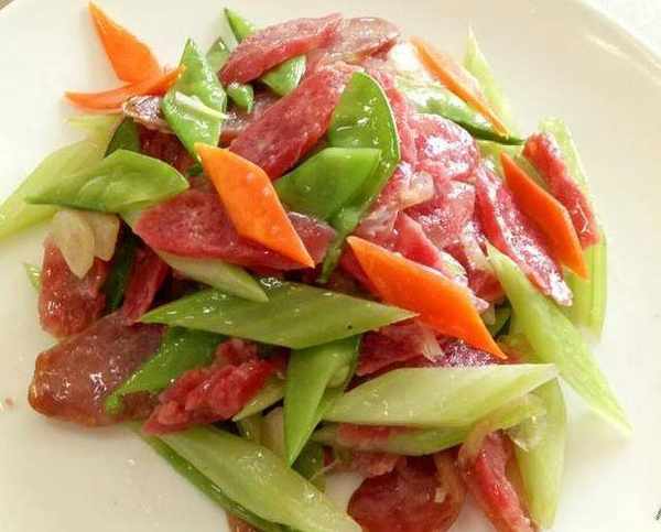 荷芹炒臘味:胡蘿卜,西芹,蒜籽,均切片,焯水,炒想蒜片,加少水倒入原料,調基本味,白醋,翻勻,勾芡,淋油即可!