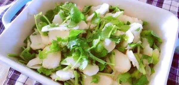 香菜拌荸薺:荸薺香菜洗凈備用,荸薺去皮切片,香菜切小段,加鹽,白糖,芝麻油少許,拌一拌即可!