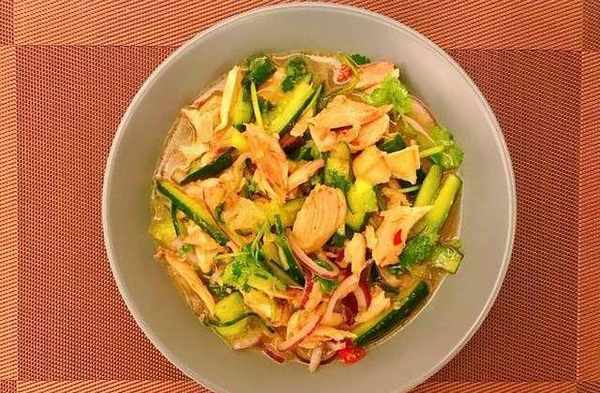 椒麻雞:首先,買包椒麻雞調料,雞腿解凍後,用生薑+蔥白+洋蔥冷水一起下鍋煮,煮至筷子戳開沒有血水,雞肉就可以拿起來瀝水啦,煮太久雞肉容易老掉,煮雞肉的時候,可以加少許糖,鹽,胡椒粉,青瓜,洋蔥切絲,小辣椒切丁(依個人口味,不喜太辣可以不要)香菜切段,雞肉用手撕開,去骨,拌入第4佐料,加入椒麻雞調料包,拌勻即可。