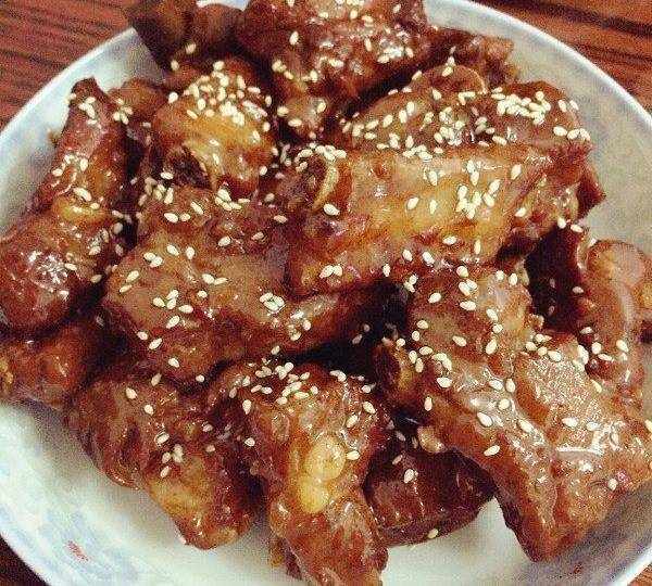 糖醋小排:肋排斬小段,沖洗幹凈,鍋裡加水,肋排放入,大火燒開,肋排撈出,濾水,用廚房紙巾把肋排上的水擦幹,鍋裡加油,肋排煎至金黃。蔥段、薑片放入,放入所有的調味料,大火燒開,小火燉煮至軟爛,大火收汁即可。