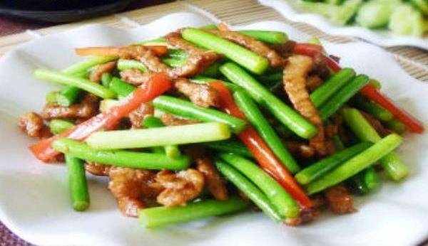 食材:蒜苔,豬肉,蔥,幹紅辣椒,料酒,黃豆醬,花生油,花椒,鹽