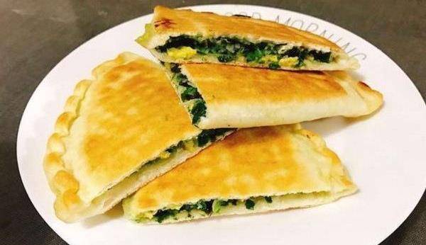 五、把準備好的餅皮鋪開,倒入餡料,塗抹均勻,對折,把邊緣粘合在一起。