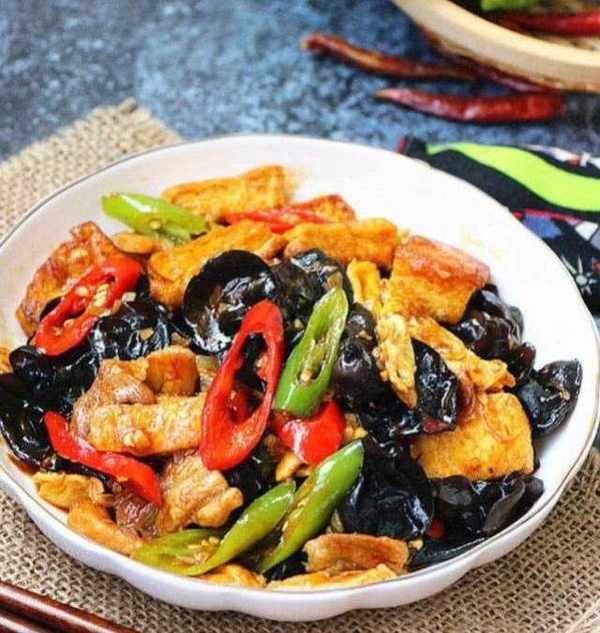 4,五花肉木耳炒豆腐。材料:五花肉、豆腐、木耳、蔥、薑、蒜米、青紅椒、豆瓣醬、生抽。做法:先把五花肉洗凈切薄片,木耳提前泡發洗凈,青紅椒切片,蔥切圈,蒜切片,薑切碎,豆腐切長方形片,鍋燒熱放入油,放入豆腐小心晃動炒鍋以免粘鍋,豆腐一面煎至金黃就翻面,兩面都煎至金黃色就出鍋備用。