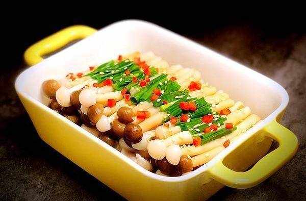 蟹味菇白玉菇拼盤:蟹味菇味比平菇鮮,肉比滑菇厚,質比香菇韌,口感極佳,還具有獨特的蟹香味,在日本有''香在松茸、味在玉蕈''之說。 白玉菇,超級珍品,通體潔白,晶瑩剔透,給人以全新的視覺效果;在口感表現上更為優越,菇體脆嫩鮮滑,清甜可口,是極具品味的美味佳肴!將這兩者結合一起做一道菜絕對是鮮上加鮮,顏色漂亮造型可愛,簡單又美味的宴客冷盤。