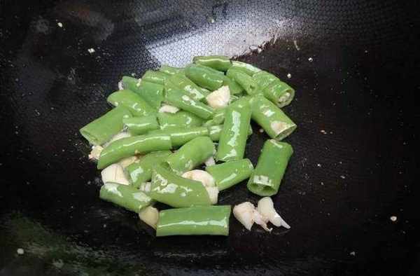 2、鍋內下油燒熱,放入大蒜、尖椒翻炒至出香氣微焦;