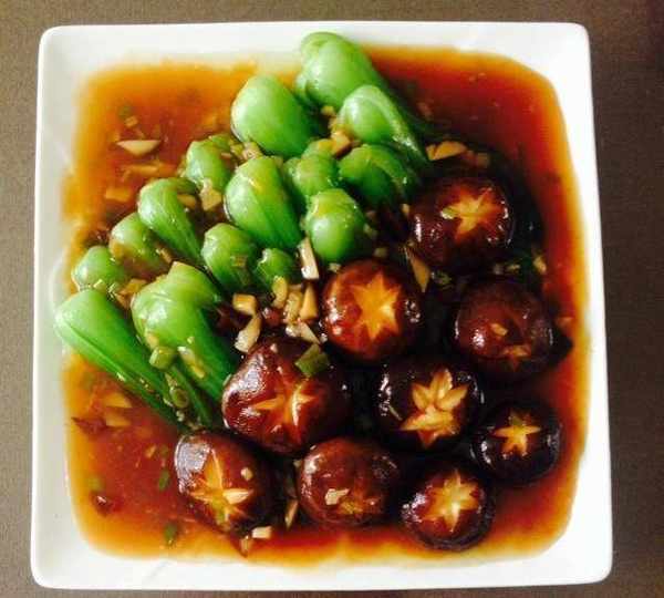 6、翻炒幾下放入燙過的香菇,炒出香味後加水小火頓下,出鍋前淀粉勾芡,香菇擺在之前炒好的青菜上,澆上湯汁就好瞭。