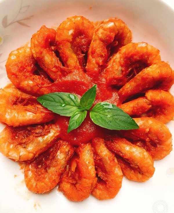 用料: 斑節蝦15隻,紅甜椒半個,西紅柿半個,洋蔥4分之1個,大蒜4個,薑2片,黑胡椒碎少許,鹽少許,糖15克,料酒少許