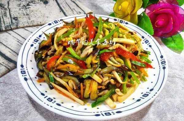 用料:茄子,豬裡脊肉少許切絲,胡蘿卜,青椒,杏鮑菇,紅椒。