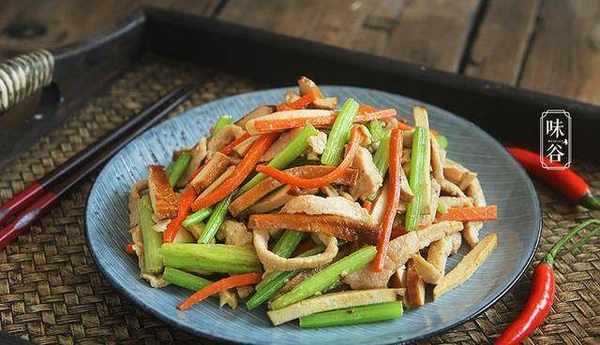 豆幹是豆腐的再加工制品。咸香爽口,硬中帶韌,久放不壞。豆幹炒肉絲,用豆幹配合胡蘿卜和芹菜,使豬肉吃起來不油膩,豆腐幹又充分地吸收瞭油汁,味道鮮美,非常適合下飯。