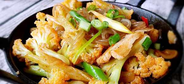 7.下生抽和鹽繼續翻炒。放入花菜混合均勻,放入青紅椒、雞精。