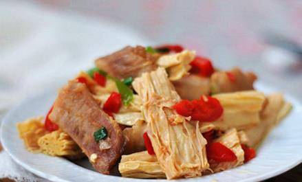 3、然後在鍋內放入青辣椒和紅辣椒爆炒,接著我們在鍋內放入腐竹翻炒,