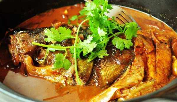 3、然後將魚頭放進去,煎至兩面金黃,接著到適量料酒,生抽、老抽,翻炒一下,倒入適量清水,不要太多,大火燒開,轉小火慢煮,煮5-6分鐘