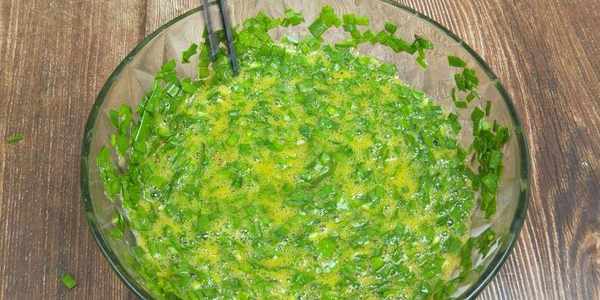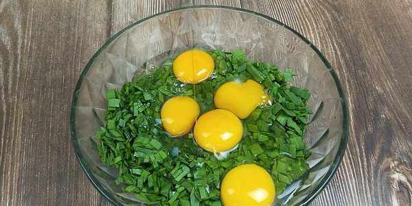2、韭菜洗凈之後切成韭菜碎,和5個雞蛋都放在盆中