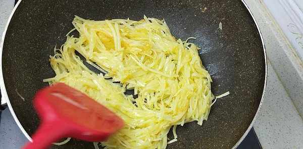 4、一個土豆擦成細絲,放在鍋中煸炒至變軟
