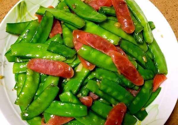 臘腸炒荷蘭豆:荷蘭豆洗凈備用,小臘腸斜刀切厚片,蒜切末,鍋中放油,溫油改中火放入蒜末炒香,在放入荷蘭豆轉大火爆炒,變色後加入臘腸和適量鹽調味,簡單快手又營養的一份美食出鍋啦!