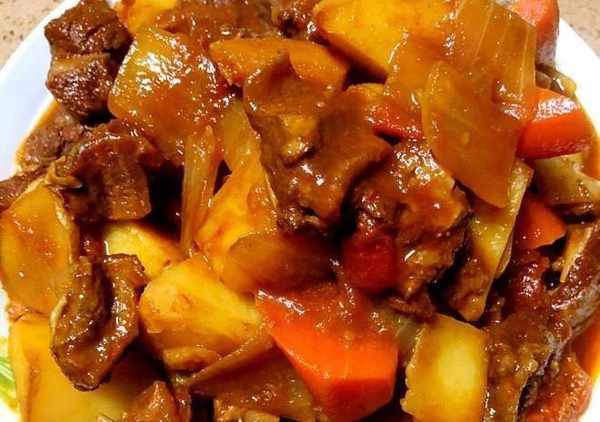 紅燴牛肉:牛肋條肉洗凈切塊,鍋中水燒開放入牛肉,撇凈血沫,撈出備用,淘大醬油少許,上色,海天醬油少許,提味,將牛肉、蔥薑、大料,桂皮,甜面醬,料酒,鹽一起放入高壓鍋中,加入開水,鍋中少許油,一起放入土豆,胡蘿卜,翻炒至西紅柿微軟,放入一半牛肉、蕃茄醬少許,牛肉湯適量,再加入些開水,沒過食材即可,大夥燒開,中火燉至土豆胡蘿卜軟,轉大火收湯,並不斷翻炒,即可!