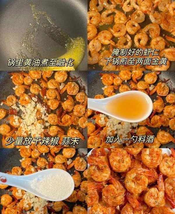 2、鍋裡融化一塊黃油,把醃制好的蝦仁放進鍋,小火煎至2面金黃,這時可以放一些蒜末和幹辣椒,開大火迅速炒均勻。