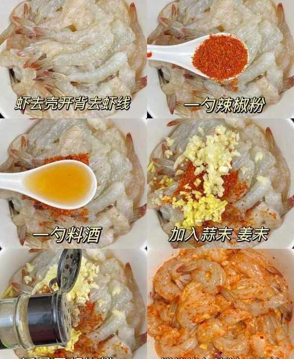 1、新鮮的蝦去殼開背挑出蝦線,蝦仁放碗裡加入1勺辣椒粉,1勺料酒,蒜末,薑末按自己口味添加,最後來點黑胡椒粉,抓勻醃制15分鐘以上。