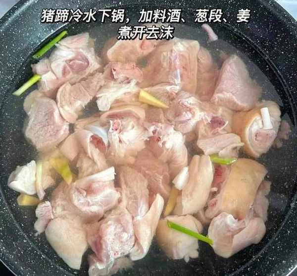 1、黃豆提前洗趕緊泡發6小時以上,豬蹄先剁小塊冷水下鍋,加入1勺料酒,蔥段和薑片,大火煮開焯水5分鐘,把豬蹄的血沫都沖洗幹凈,再撈出來備用。