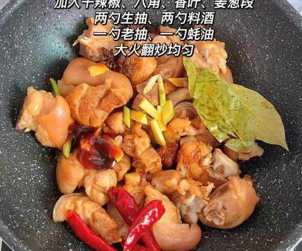2、起鍋燒油,先小火把冰糖炒出糖色,接著把豬蹄放下鍋裡翻炒把豬蹄上色均勻,加入2勺生抽,2勺料酒,1勺耗油,1勺老抽,幹辣椒,八角,桂皮,香葉也放進去,開大火翻炒2輪把香料炒均勻。