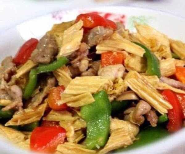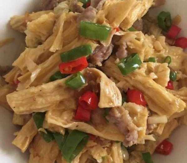 4,腐竹炒肉。材料:瘦肉,腐竹,紅辣椒,蒜苗,薑,生抽,料酒,蠔油,生粉。做法:先把腐竹提前泡水至變軟,薑切絲,蒜苗切段,紅椒切片,瘦肉切片用生抽,雞精,薑切末,料酒,生粉醃29分鐘左右,腐竹切成段。