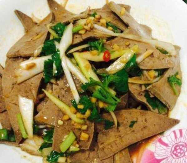 2,涼拌豬肝。材料:豬肝、薑、蒜米,生抽,香油,香菜,料酒,雞精,陳醋,紅椒。做法:先把薑切成薑片和薑絲,蒜米切成蒜蓉,香菜洗凈切段,紅椒切成絲,豬肝切成片,放到水裡清洗一下,鍋裡放到水燒開,放入薑片,料酒,豬肝煮至豬肝熟透出鍋洗凈瀝幹水分備用。然後把瀝水分的豬肝放到碗裡,放入蒜蓉,香油,薑絲,生抽,雞精,紅椒,少量陳醋一起聚均勻就可以出鍋瞭。
