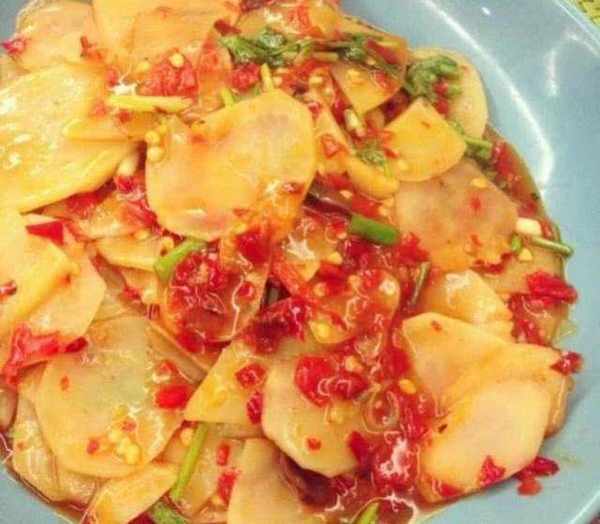 3,剁椒土豆片。材料:土豆、剁椒、蔥、雞精,生抽。做法:土豆洗凈去皮切成片,放到水裡洗凈撈出瀝幹水分,蔥切成蔥白和蔥段。鍋裡下油燒熱下土豆片翻炒1分鐘左右,放入剁椒翻炒至土豆差不多熟的時候,放剁椒一起翻炒一下,再放生抽,雞精,蔥段一起翻炒均勻就可以出鍋瞭。