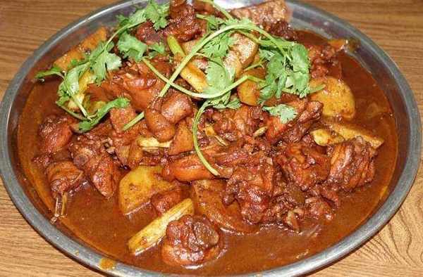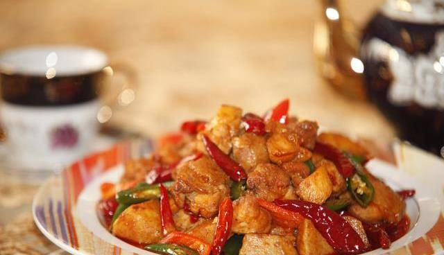 接著我們多放一點油在鍋中下花椒,把花椒炸幹倒入雞塊,還有蔥薑蒜以及各種鹵料翻炒幾分鐘後,倒入一些醬油和水,記住水一定要多加一點。然後撒上砂糖,鹽,料酒等蓋上鍋蓋悶15至20分鐘,最後倒入土豆開小火煮到土豆熟瞭為止。快起鍋之前倒入青辣椒和紅辣椒,這樣的話會比較好看,在略略翻炒一下就可以出鍋瞭剛出鍋的大盤雞紅色辣椒配上黃色的雞塊顯得十分的可口。