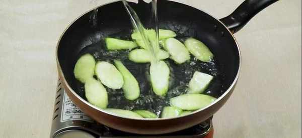 第三步:另起鍋燒油,油熱後倒入絲瓜,翻炒幾下,然後倒入適量清水,放入薑,蓋上鍋蓋,大火燜煮15分鐘左右。