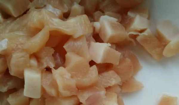 第一步:首先將雞胸肉洗凈,切成小塊,將雞胸肉裡的筋膜挑幹凈,放入料理機中,進行攪打,當雞肉泥攪打細膩後,停止攪打。