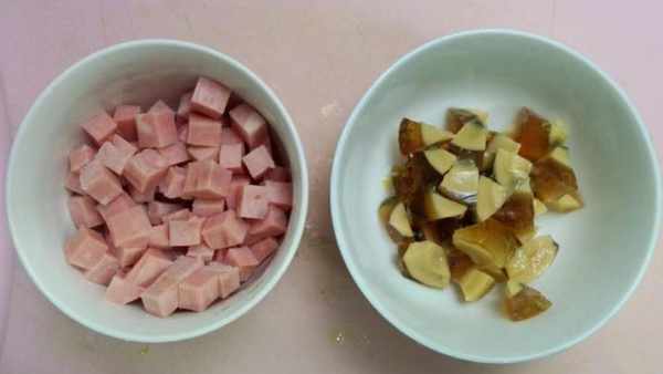 第一步:首先我們要將娃娃菜的葉子全部分開,去掉根部,然後將火腿腸、松花蛋切丁。