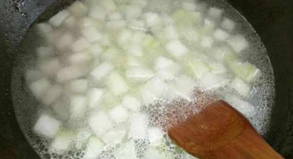 第四步:待蝦變紅後,倒入恰好沒過蝦頭的水,加入適量鹽進行調味,然後倒入冬瓜,蓋上鍋蓋,燉到冬瓜變白即可。