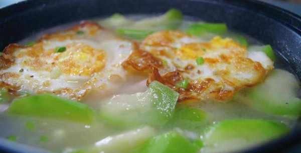 第四步:打開鍋蓋,加入事先煎好的荷包蛋,再次燉煮5分鐘左右,這樣我們的絲瓜雞蛋湯就做好瞭。