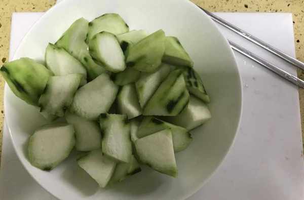 第一步:先將冬瓜洗凈削皮,然後切塊或者切片。將鮮蝦洗幹凈,去殼,取出蝦線,蝦頭留下備用。