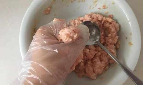 第五步:將湯大至燒到70度時,開始往湯裡下雞肉丸子,用左手抓肉泥,在虎口位置擠出雞肉丸子,用小勺下入鍋裡即可。