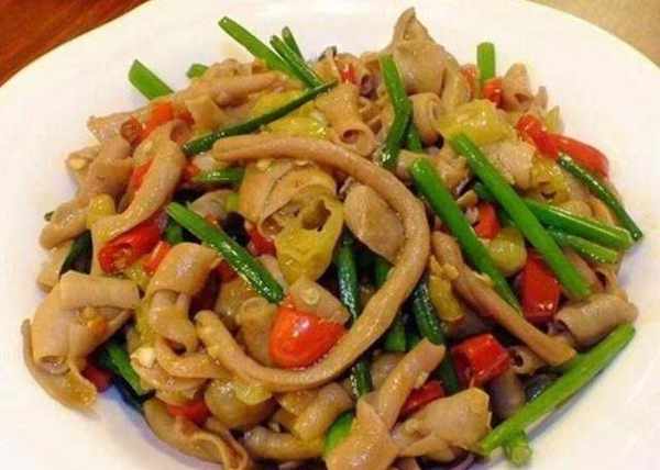 做法:鴨腸放入盆中,加入生粉和鹽用手抓洗幹凈,然後用刀去掉鴨腸的肥油,盆中再次加入生粉和鹽,另外倒入幾滴白醋,再次反復抓洗鴨腸,菇和蔥洗幹凈,蔥條切段備用,熱鍋涼油燒至7成熱,倒入海鮮菇和茶樹菇翻炒2分鐘,接著放入蔥頭,加入一點水,蠔油生抽一起燜3分鐘,直至快收汁時,倒入鴨腸和蔥尾,加入少許鹽一起大火翻炒均勻,看到鴨腸卷起立馬出鍋即可。