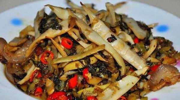 材料:竹筍,紅辣椒,酸菜,鹽,雞精,豆瓣醬,料酒,生粉,油。