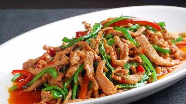 6.肉絲炒到約八成熟時,下炒過的青椒絲同炒勻。