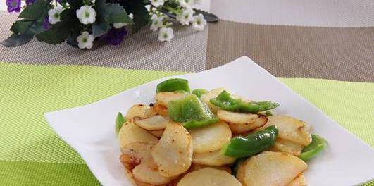 【青椒炒土豆片】1、將土豆切成薄片後再用清水沖洗兩遍,準備好其它的食材