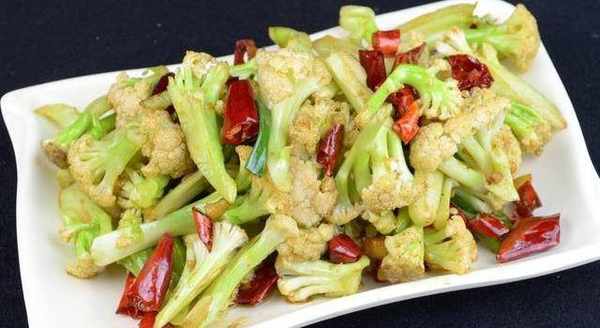 3.炒鍋裡倒入植物油,油熱後放入菜花煸炒至菜花邊緣焦糊,盛出備用。