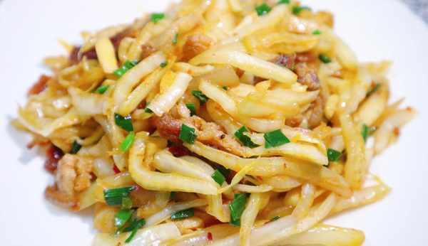 1.白菜梆子洗凈切成絲,放鹽醃制十分鐘出水控幹備用;