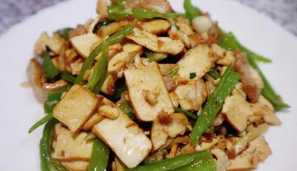 食材:香幹三塊、青椒兩個、瘦肉半斤、薑蒜、花椒粉、雞精、生抽、鹽、食用油