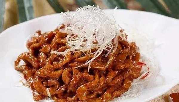 3. 炒鍋置旺火上,放混合油燒熱至六成油溫時,放入肉絲炒散,加甜醬炒出香味,噴入滋汁,待收汁亮油即可起鍋裝盤,將瀝幹水分的蔥絲放在盤中肉絲上面即可。